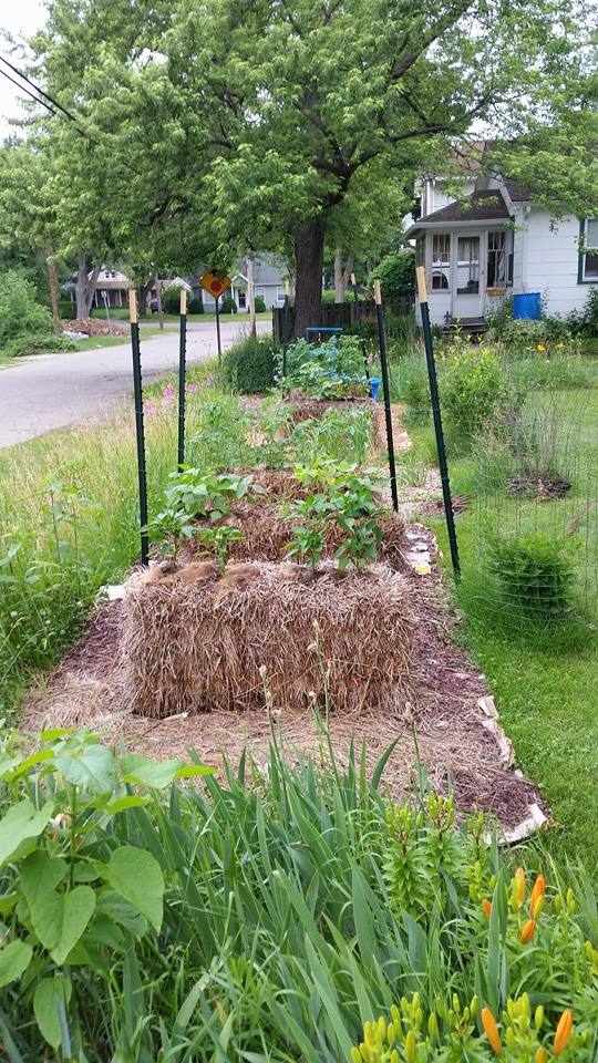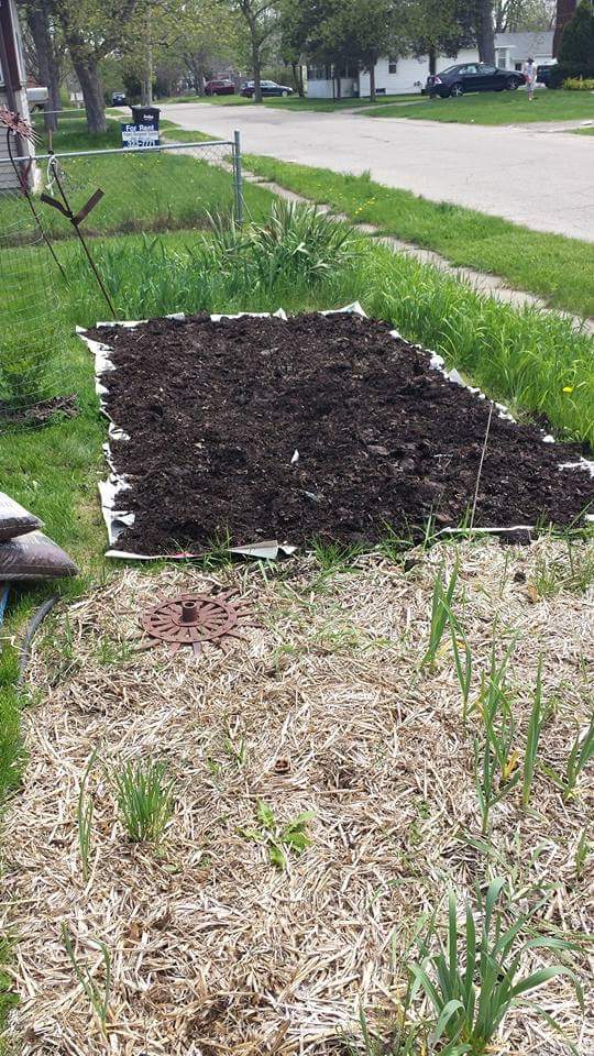 In my pursuit for more growing space, I prepared two plots in the back of the yard. I put down cardboard that I got from our former cafe at work, and from a coworker who had a passel of it that she wanted gone. I laid straw down over the top of it and let time/nature do its thing. The neat frames you see there were donated to me by two dear friends who decided they didn’t need them, as they came with the house they bought. Another friend drove to the west side of Kalamazoo and brought them to me!
