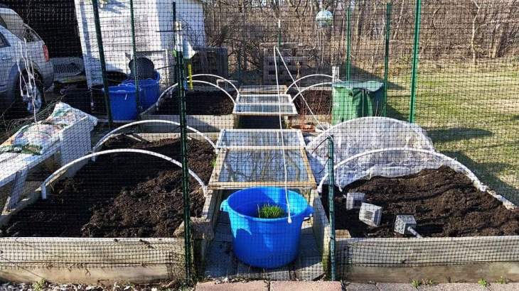We built them over a couple of weekends in the heated garage of the Best Sister Ever. It was a team project led by our dad and the BSE’s husband Gadgetron. Once we had them constructed, we toted them on over to the house and laid them out. The bottoms are covered in metal mesh to keep the burrowing critters out, and I’ve had reasonable success with that. We also opted to use the PVC hoops. Those hoops are worth it, in my opinion. They lengthen my growing season, if I want to do so. I’ve been able to have year round lettuce and spinach, using plastic sheeting to cover the hoops.