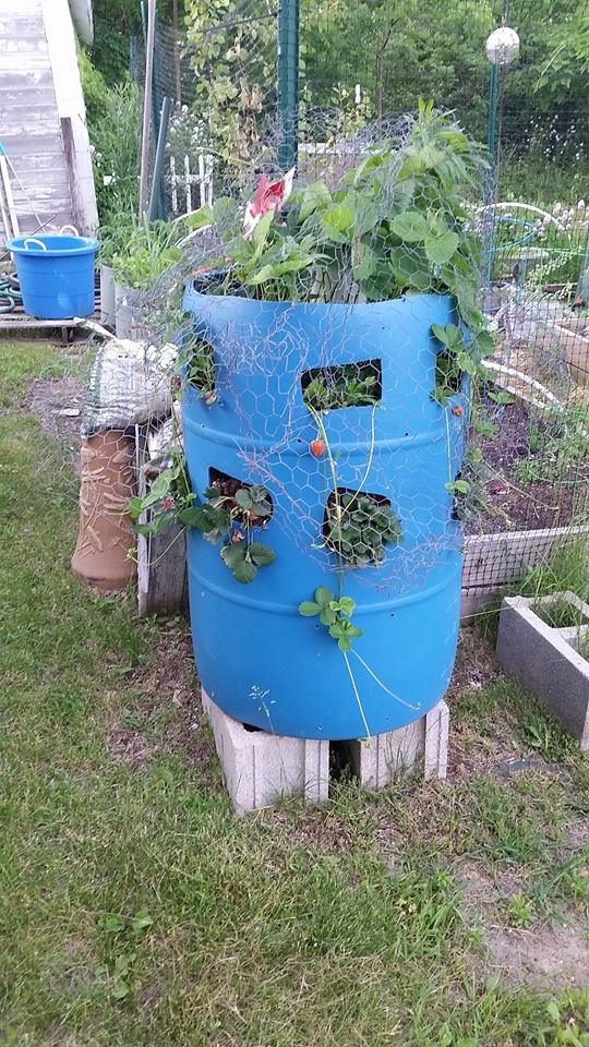 Casting about for yet more ways to maximize my space, Dad and I decided to try to make planter of a 55 gallon plastic drum. There are numerous videos online of how to do it, and I realize mine looks like it should be on the “Nailed it!” section of CakeWrecks. There are drainage holes in the bottom, then gravel, then dirt. If I had it to do over, I’d do more holes, but smaller. You can barely see it here, but down the middle is some perforated PVC drain pipe. The thought is to be able to water down that pipe and thus keep the planter hydrated. The directions said fill the pipe with sand. I think that was probably the dumbest thing to advise, because OF COURSE the sand ran out the holes in the pipe! Again, if I had that to do over, I’d use gravel, like river rock, not pea gravel.