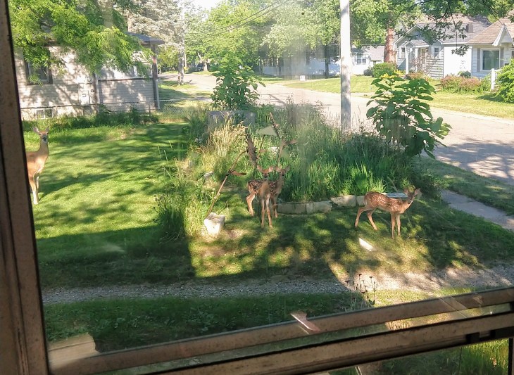 I have fawn triplets! Triplets are kind of rare and these are precious. Aren’t they the most darling? I think they have been bedding down in the front blueberry/garlic beds during the day. I know they’re well fed. Their stupid mom ate all my hosta.