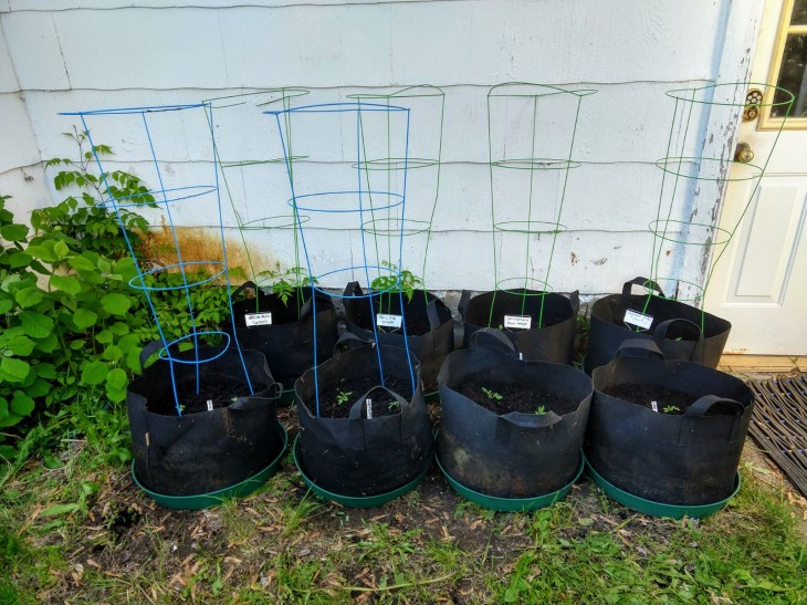 I did get around to seed starting this year! I started tomatoes indoors in April, and put them in fabric pots in early June. I have eight varieties this year! Green Zebra, Chocolate Stripes, Vintage Wine, Amish Paste, Opalka, San Marzano, Ace 55, and Trip-L-Crop. Here’s how they looked in June.