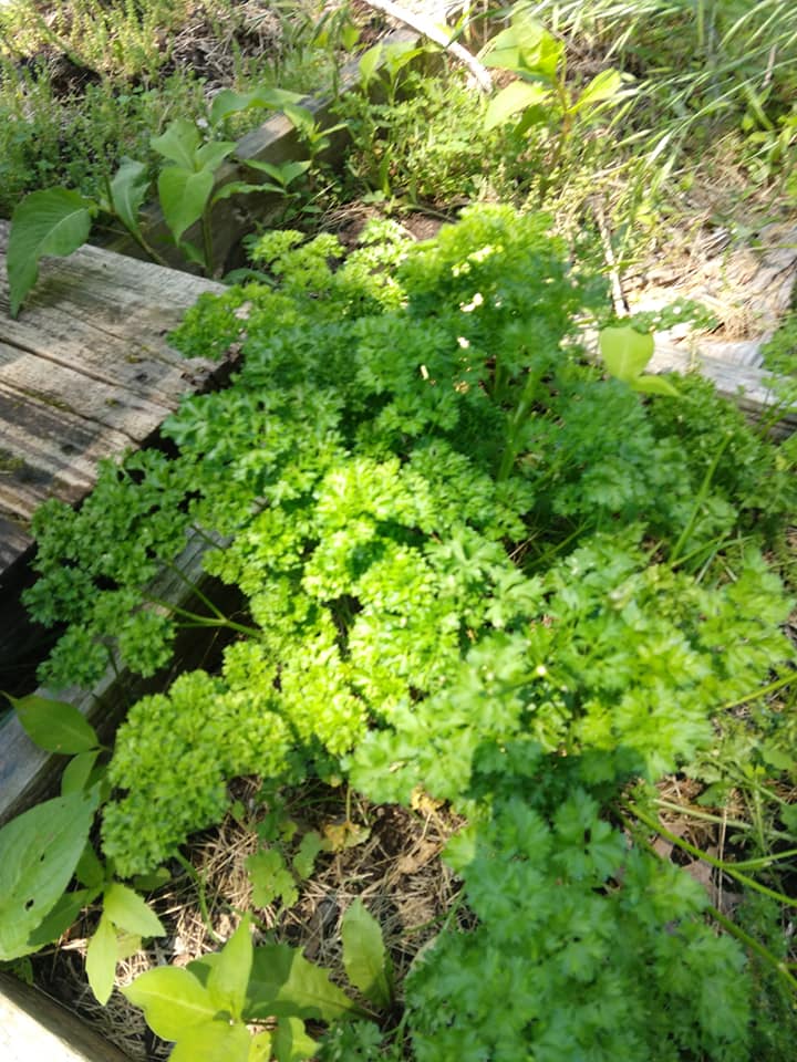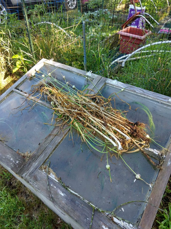 Speaking of garlic, I dug all of it from the front beds as I plan to remake that space next year. The bulbils from last year that I carelessly threw in the back of the yard grew into a huge patch, so I’m covered for garlic. Garlic bulbils are what you get when the garlic “flowers”. It makes top sets of little bulbs that you can easily replant. Garlic is truly the gift that keeps on giving. If you look in the upper left and lower right of this photo you’ll see the bulbils. They’re in a papery husk, and if you just rub it between your fingers it will break open and you’ll have a good number of bulbils. Last fall I just threw them on the ground and walked away, and this year I had garlic for days. I heavily sowed this year’s bulbils in the back herb bed, so I expect next year I’ll have a nice crop there as well, with the side benefit of deterring the deer, as much as one can actually do that. .