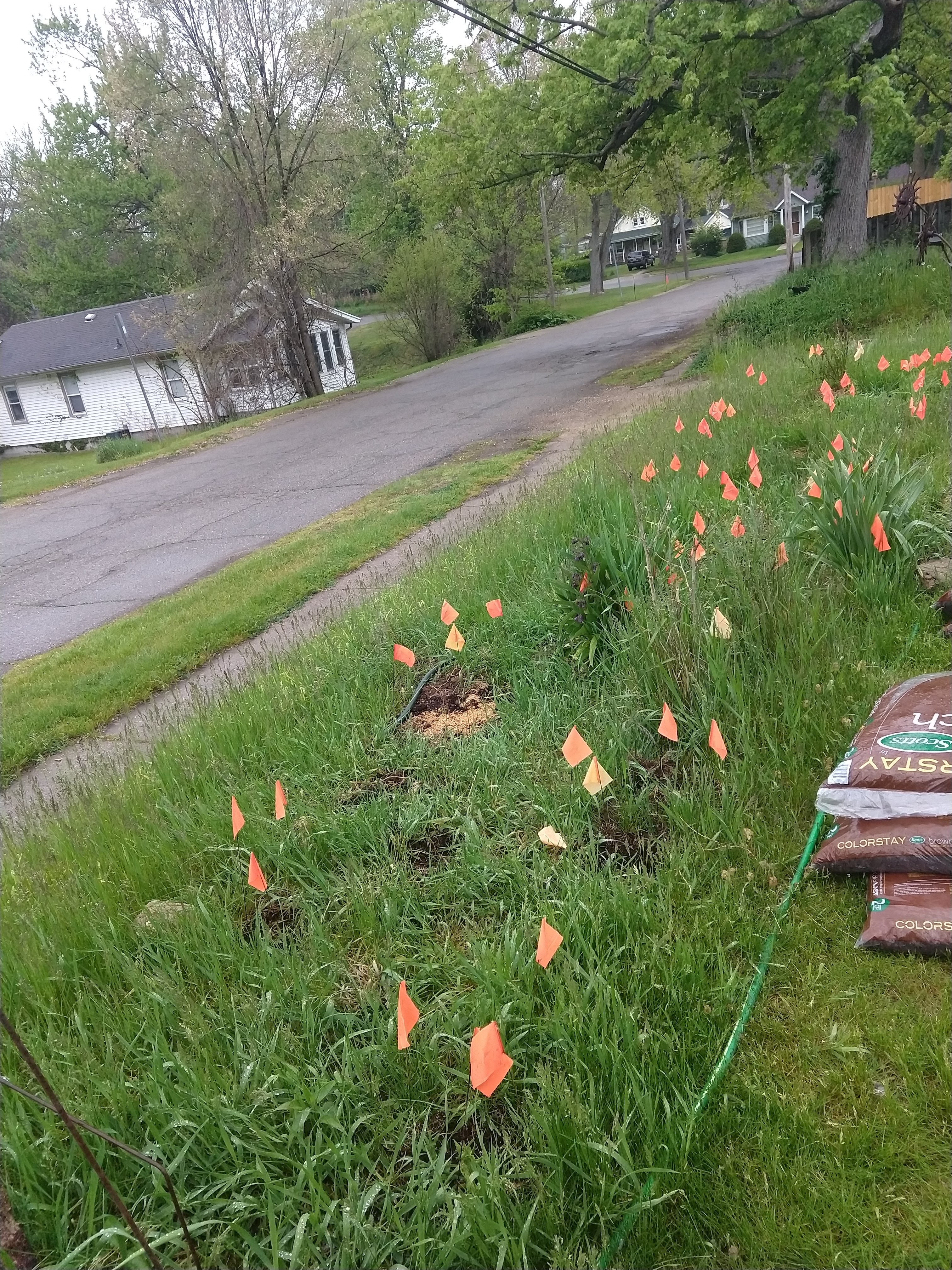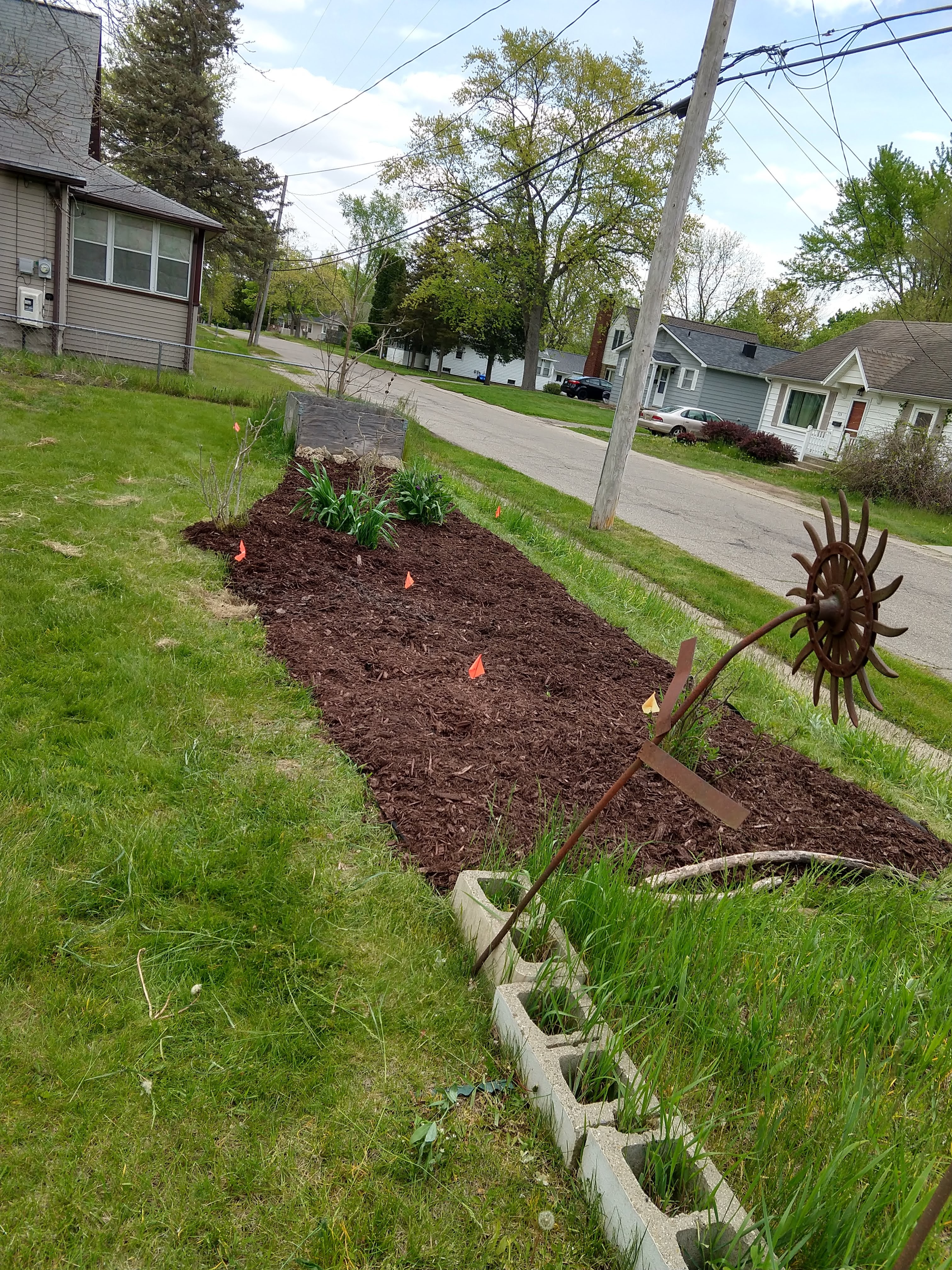 The flags mark where my perennials were planted. I have peonies, yarrow, lupines, hollyhocks, coneflowers, salvia, lilacs, comfrey, and two Rose of Sharon bushes. It will take a couple years to get really gorgeous, and in the meantime I was dissatisfied with how it looked. I bought several bags of mulch and prepared to spread it out.