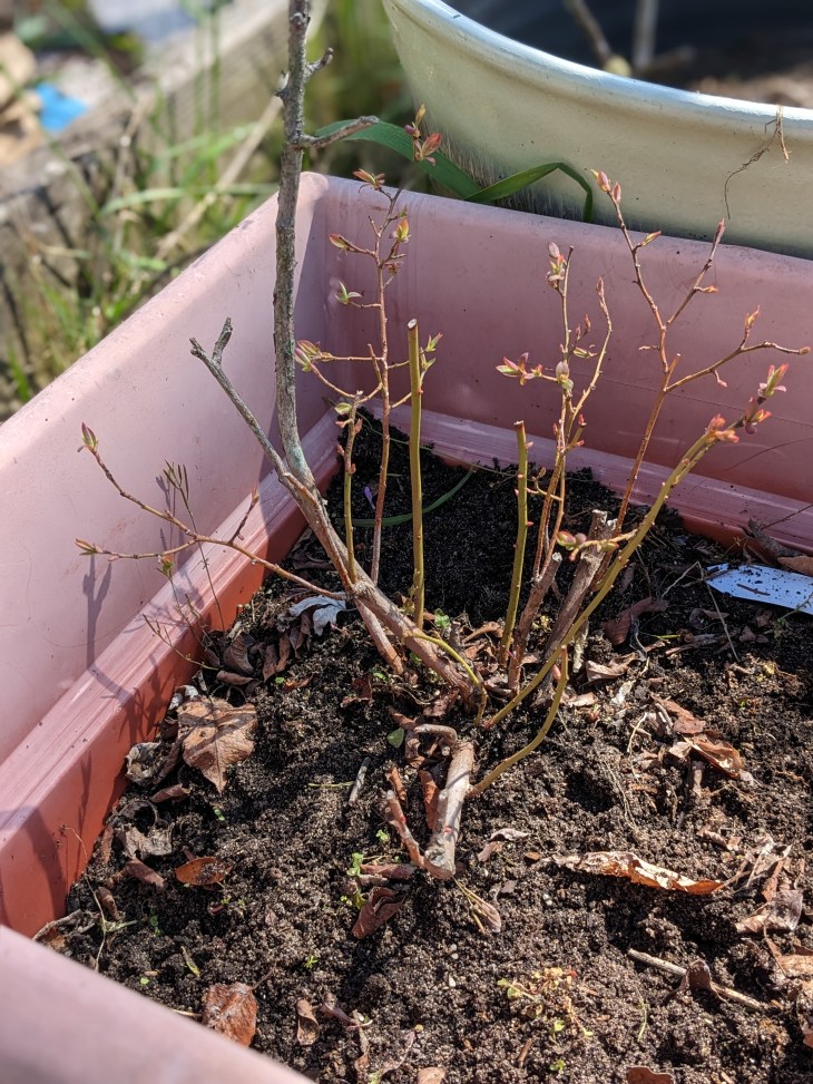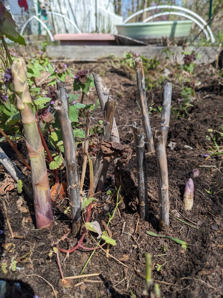 I did the asparagus bed by hand because shoots are coming up! I left the red clover since it’s a pollinator favorite early in the season and a nitrogen fixer. I have 10 more asparagus crowns coming next week, Mary Washington and Purple Passion, so I got spots ready to plant those as soon as they come in and have had a long soak in the sink. It is lovely seeing new asparagus shoots coming up! I may have enough this year for at least one meal.