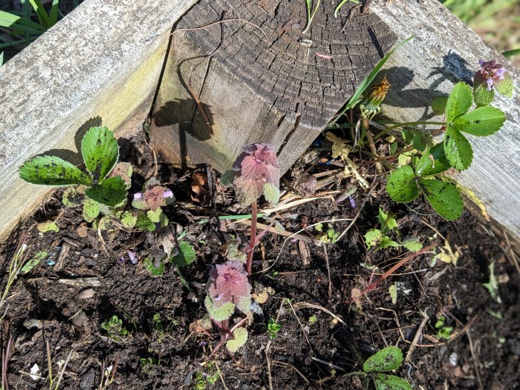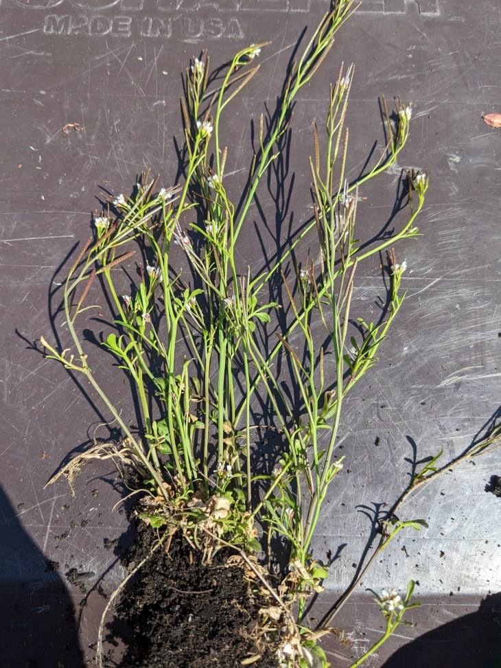 My main goal was to get the grass and the hairy bittercress up. Hairy bittercress is pretty, sure, but when it goes to seed you can’t touch it without the seed heads exploding and thus making sure you’ve got it FOREVER. I’m trying to get ahead of it this year.