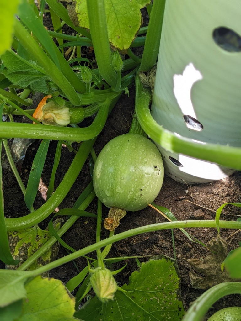 The 8 Ball zucchini is enjoying the protection of the blue barrel planter. The deer don’t seem interested in the foliage that’s showing over the top. I have a ton of flowers below the top edge and this little squash ball. 8 Ball has a really nice flavor and is one of my longtime favorites.