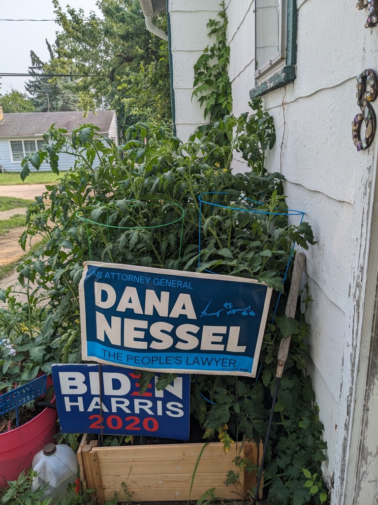 The Dana Nessel Tomato Jungle is certainly enjoying these hot and muggy days. The Michigan AG’s campaign sign is keeping it corralled and fending off the deer. You see Joe and Kamala are backing her up! This bed contains three heirloom varieties, Arkansas Traveler, Mr. Stripey, and Big Rainbow. They’re all flowered out and I have a few small tomatoes getting started.