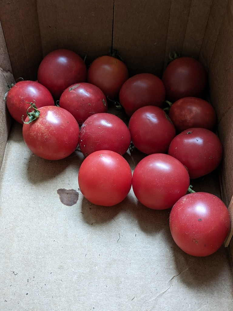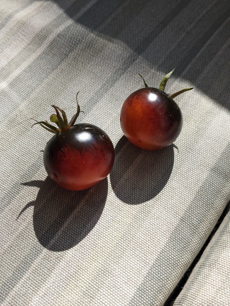 I’m starting to get tomatoes! Midnight Snack cherry tomatoes are ripening quickly and I’ve pulled a good number of Arkansas Travelers from the Tomato Jungle. Aren’t they pretty? Midnight Snack is a deep indigo blue, almost black, and when they’re ripe they get the red blush shown below. They’re delicious! Arkansas Traveler is a little smaller than a tennis ball and has a nice rich tomato flavor.
