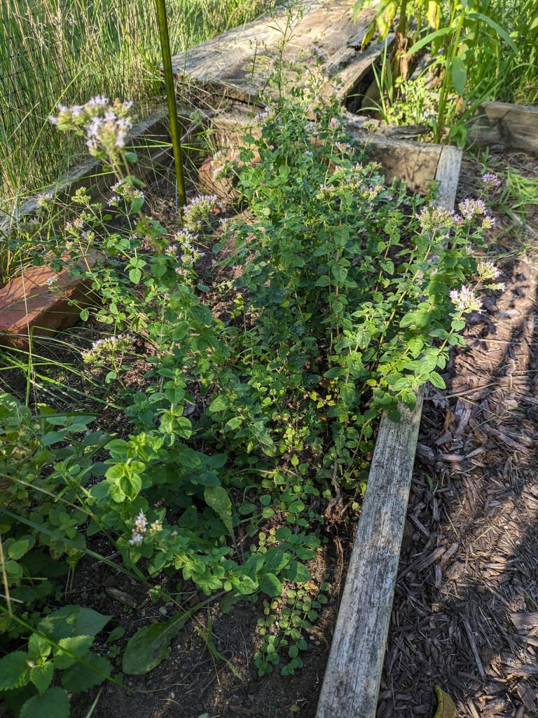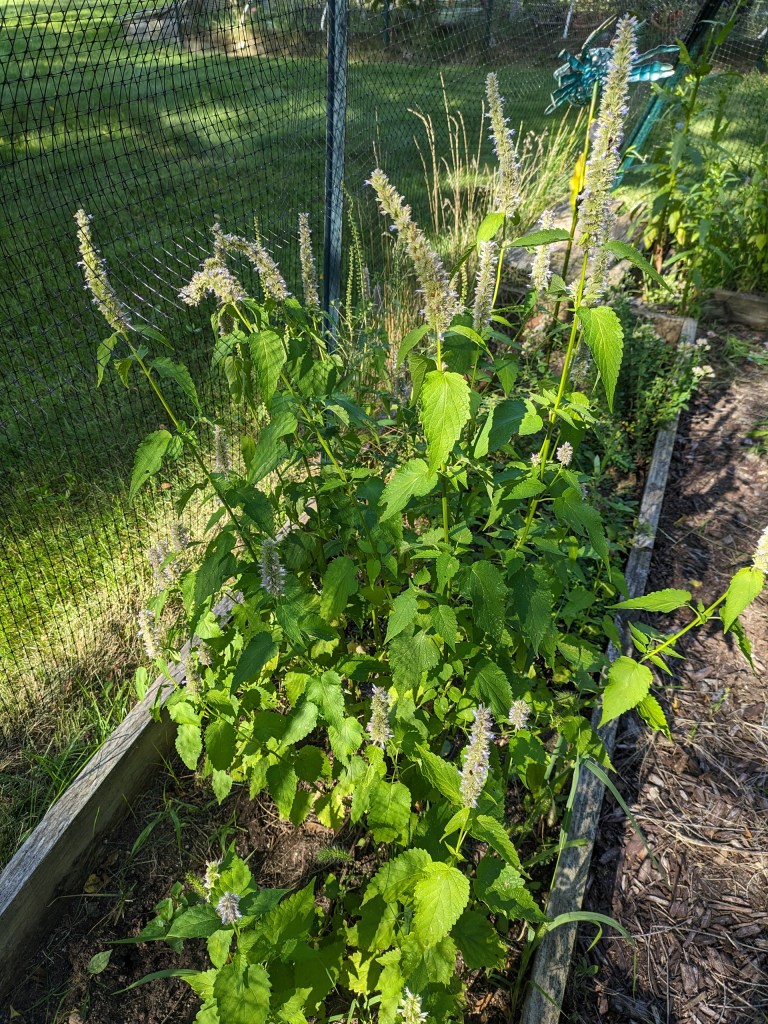 The herb bed is going bonkers. The garlic chives I started in a pot this year are getting stronger and I have hopes that they’ll become a dependable stand like the regular chives I keep in a tub in my raised beds closer to the house. Those chives have been with me since the late 90s. Yes, really. I also have mint for days, as well as crazy amounts of anise hyssop, oregano, and lemon balm. The porch pots are giving me dill, green onions, parsley, borage, the last of this batch of cilantro, and an avalanche of basils, both Thai and Genovese. I see a pizza glow up in my future with the oregano and the basil, and I plan to dry many of the others for tea this winter.