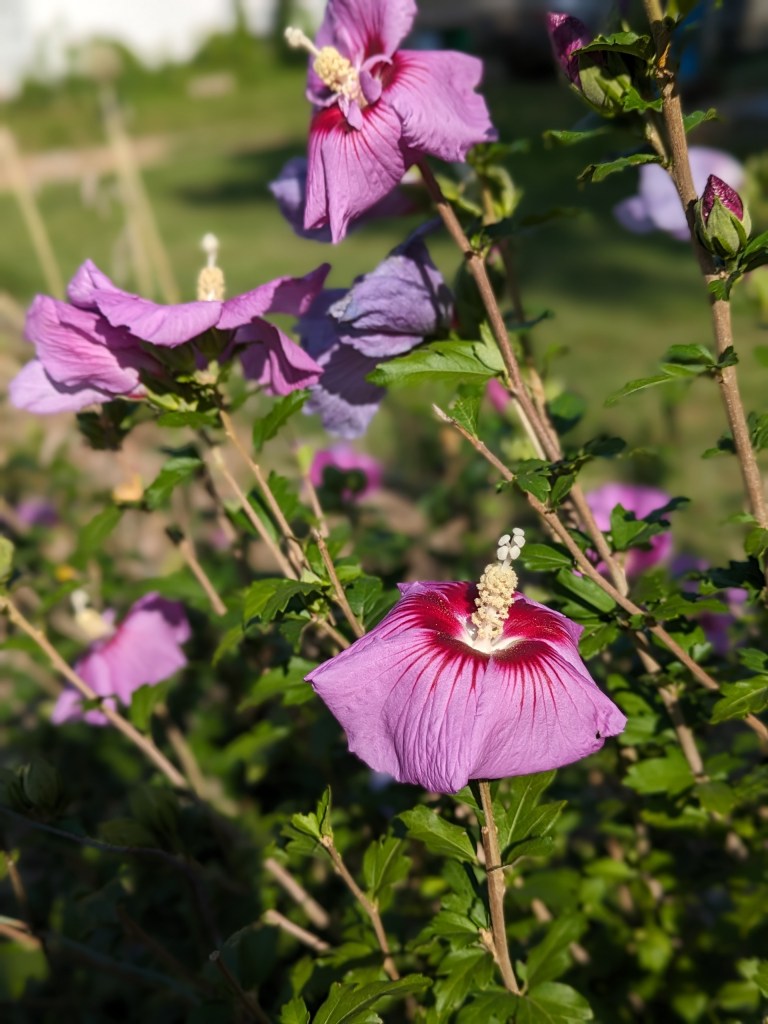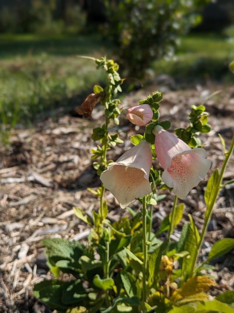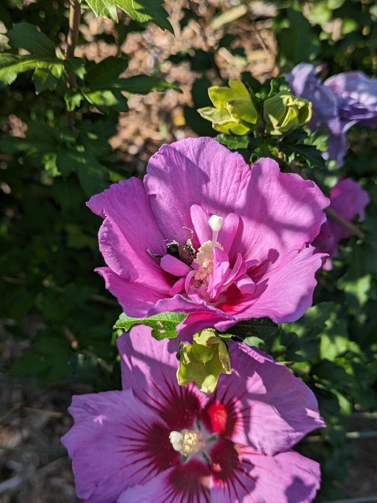The perennial bed I started two years ago isn’t moving quickly enough for me, but I need to be patient. These things take time. I do have gorgeous flowers on my Rose of Sharons this year, and the peach foxglove is gorgeous. Look for the pollen covered bumblebee butt in the Rose of Sharon blosso