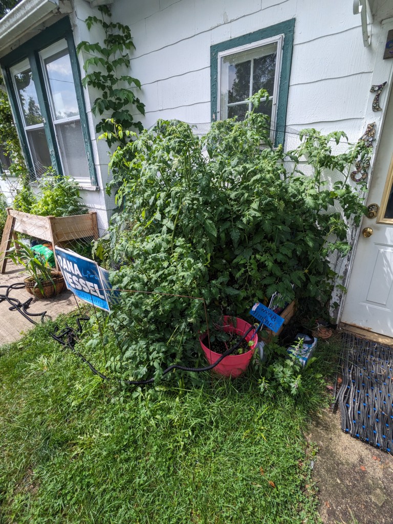 The Dana Nessell Tomato Jungle is going great guns. You can go back to the last post and see how it’s grown in the last month. It’s at least half again as tall! I have put net over the plants which has been a mixed blessing – it’s kept the birds and the deer at bay, but I have to be vigilant that the plants don’t get too tangled up in the netting. I love that now it’s leaping out of the bed along the bottom. The smell of tomato leaves is a favorite of mine, so I get a nice burst of that every time I go in or out the kitchen door.