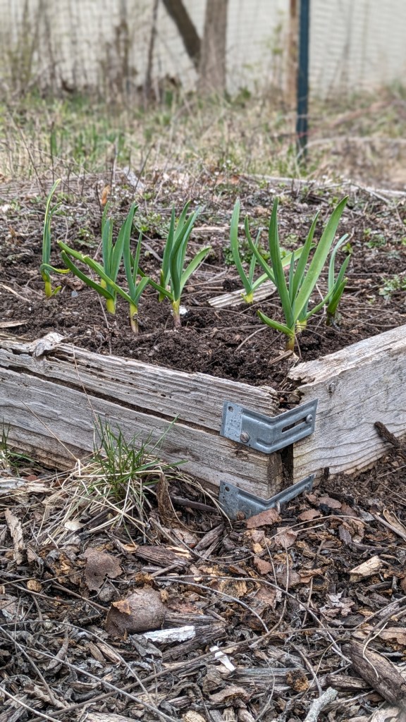 Speaking of the herb garden, it does look like my lavender overwintered! The garlic chives are about to burst forth, the oregano is looking happy, and the aforementioned anise hyssop is already greening up. But the absolute GLORY of my herb bed? Yeah, it’s this right here. Every single clove of garlic I planted last fall came up. I’m about to be in garlic scape stir fry heaven, and this fall I’m going to dig up this bounty and cure it for the winter. I’m thinking about a garlic honey, actually, since we’re getting bees this spring.