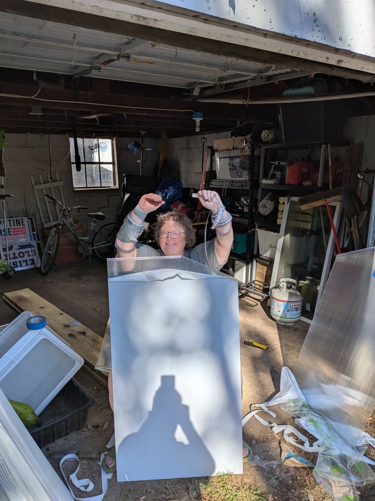 They are building a greenhouse over at the garden, bigger than this one, and from scratch using reclaimed materials, including a bunch of windows I had in the garage, and the doors from the Crabtree family farmhouse on Kirby Road. They’re letting me put a little plate on the finished greenhouse that honors my dad, Jon Crabtree. That way, they can feed the people year round. They’re all old (read, my age) people who don’t want to do the extensive digging involved for a greenhouse of that size.