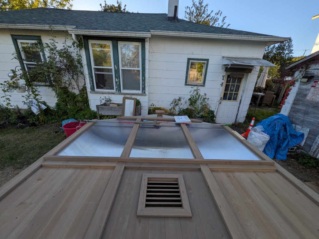The front wall was a real pain in the rump that took a good part of the day. The back wall went quite a bit faster! I spent some quality time wrapping the edges of the polycarbonate panels with the fancy tape. We had two walls done at the end of Day One.