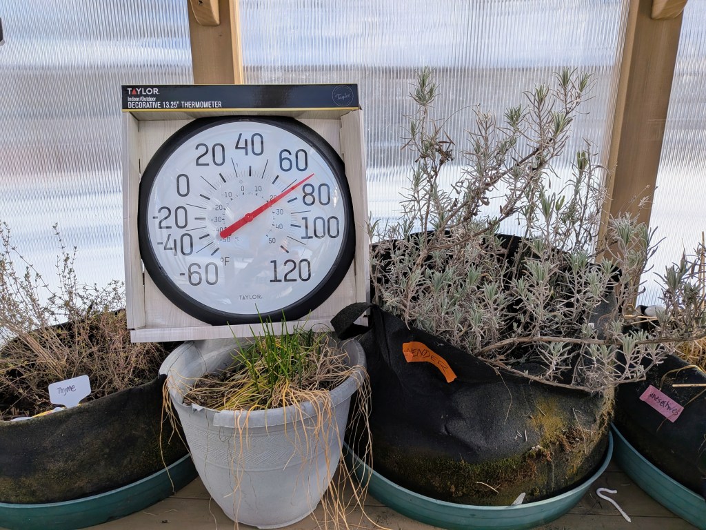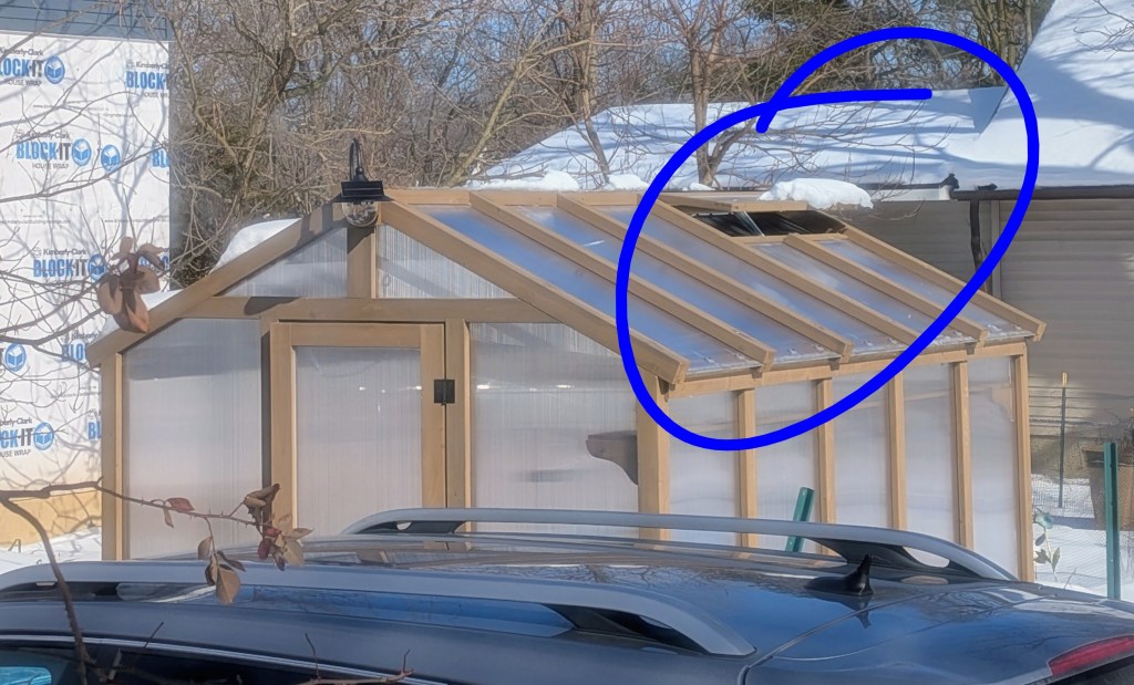 Because it was toasty in the greenhouse today, the automatic venting windows kicked in! They didn’t open on the north side of the roof, but the south side opened for the first time in a long time. These windows open when the temps in the greenhouse exceed 70 degrees.