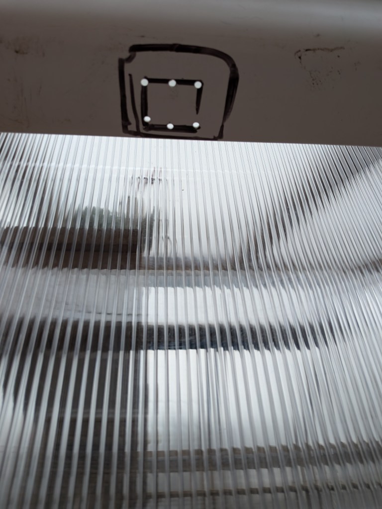 I traced the outlet hole by sticking a marker up through the drop piece. My first attempt was drilling small holes around the outline, but in the end I used a 2-inch hole saw to cut the opening cleanly.