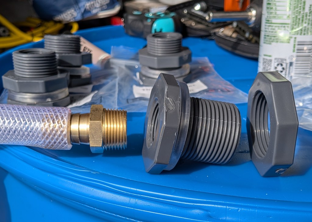 I located the bulkhead pieces. The bulkhead fitting passes through the wall of the barrel. The bulkhead comes with a rubber gasket and a locking nut. The gasket goes on the bulkhead before it is pushed through the hole, and then the locking nut is tightened from the inside to compress that external gasket and create a watertight seal. The brass hose barb fitting will screw into the bulkhead and the flexible hose is pushed onto the barb.