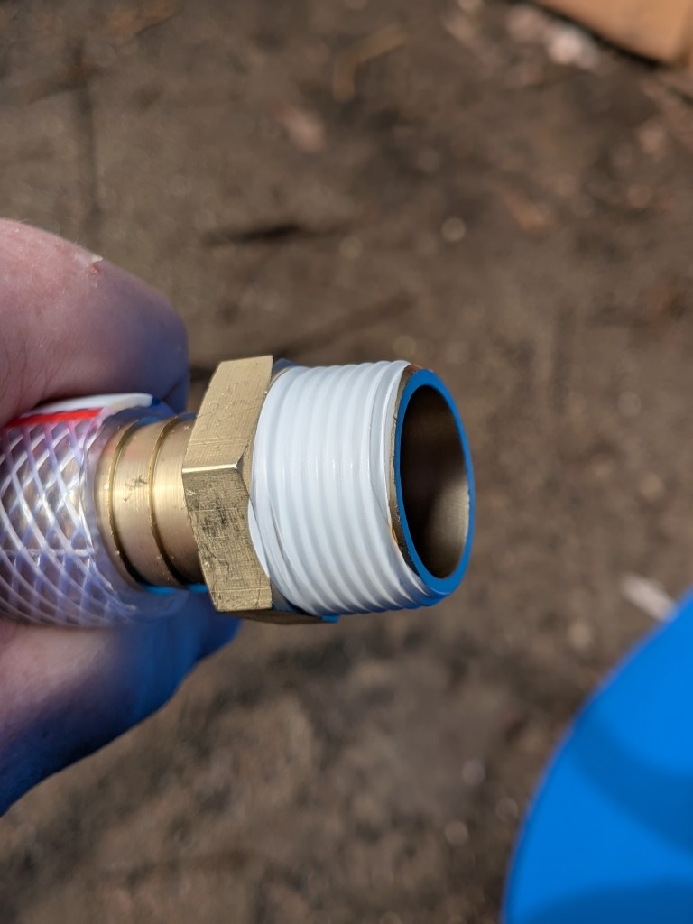 I unhooked the remaining barrels and rolled them into the garage, repeated the whole squat, reach, cheek press, feel for nut process, and here again, my annoyance strengthened me: those nuts are absolutely hand-tight and more, and passed the leak test.