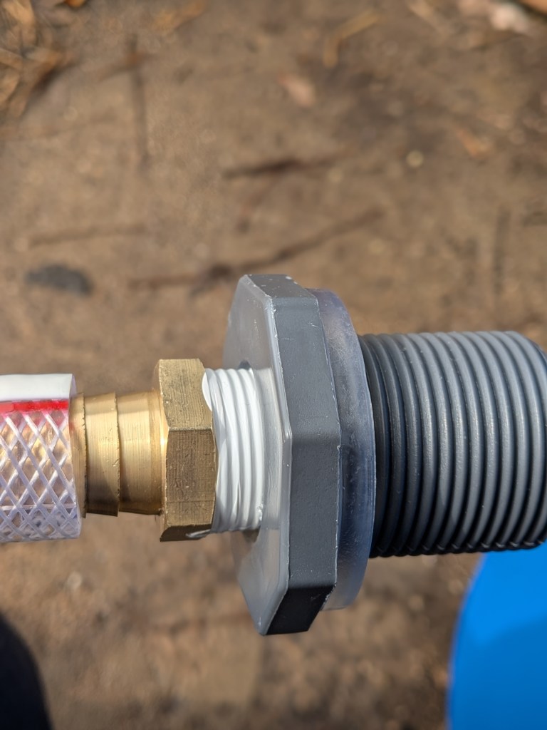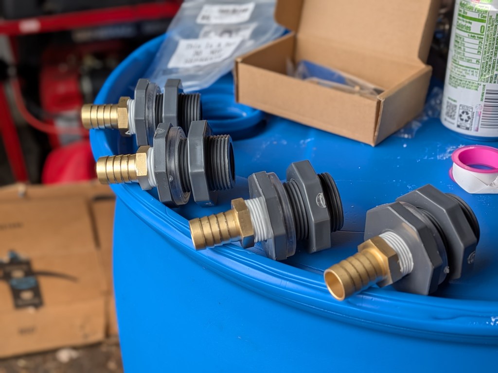 Another learning moment: wait until you have leak tested your bulkheads before you affix the hose and clamps. If your bulkheads fail the leak test you’ll have to go back and unhook them to get into the barrels to tighten the locking nuts.