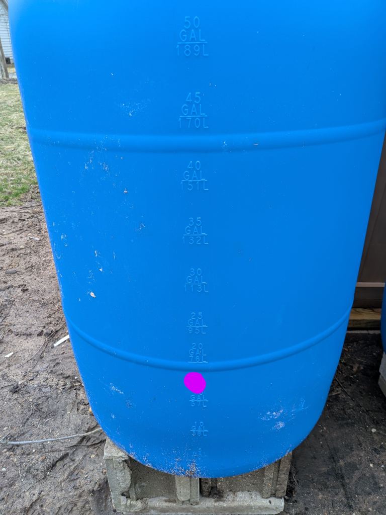 I marked the holes that I’ll need to drill. These barrels are food grade and have a handy gallon measure on the side. This made it very easy to mark consistent holes in the barrels. The first barrel needs one hole, and that is the intake barrel from which the water will flow into the other three. Barrels two and three have a hole on each side, to make the connection. Since these barrels are cast molded, it was easy to make a corresponding hole on the opposite side by following the molding seam. Barrel four will have one hole to receive the last connection.