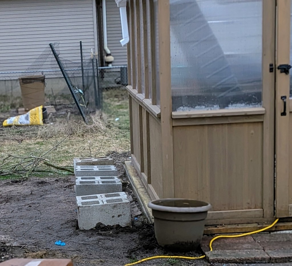 While I waited for the bits to arrive, I busied myself with other prep work. I bought four 16×16 concrete pavers and leveled those. Then I placed two concrete blocks side by side on each paver and leveled those as well. I stood the barrels up, and tried to level those and that is where things went a little sideways. They’re straight now, even though I know this photo shows that first set looking all the way wrong.