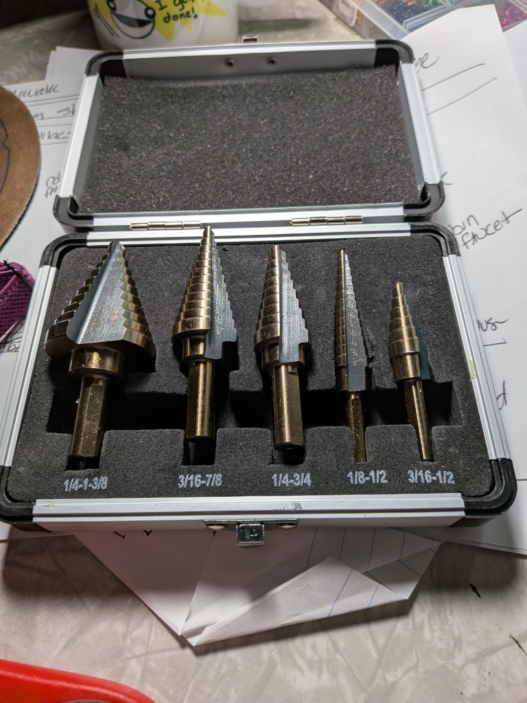 I ordered step bits online since local prices were ridiculous — about $50 and up for a single bit — and the local selection was basically “this is what we have, hope it works.” I got a set of five for about a third of the cost of one purchased locally. They were supposed to be here by 8 am Saturday morning.