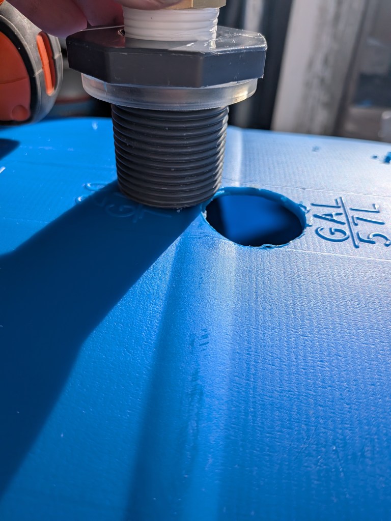 Now that I had the step bits, I hit the ground running on Sunday morning. Once the holes were drilled, I placed the rubber gasket onto the bulkhead and pushed the threaded flange through the hole. To install the locking nut, I sat in a chair and turned the barrel sideways, resting it against the trash can so it wouldn’t move while I shoved my arm through the top opening.
