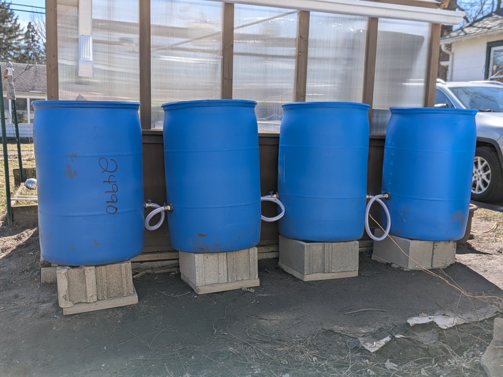 My greenhouse is 8 × 10 feet, but the barrels only collect runoff from one side of the roof, so the catchment area is about 40 square feet.