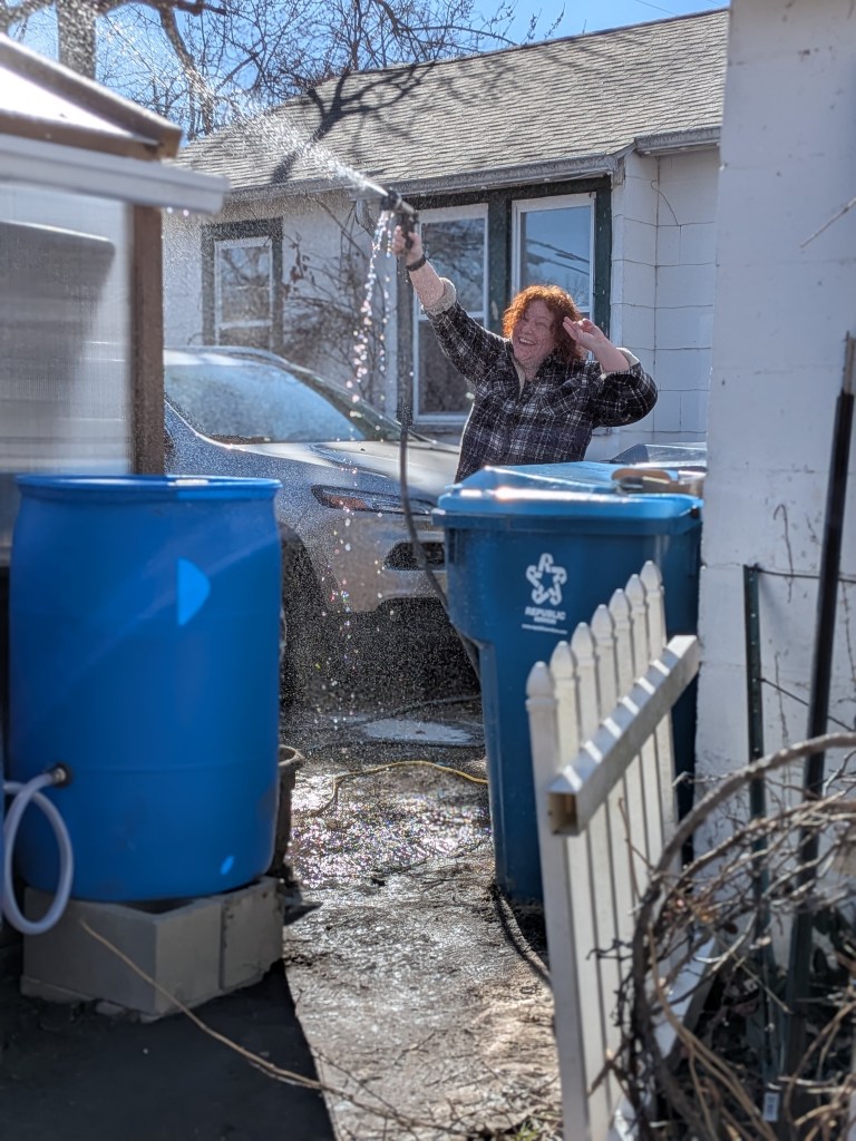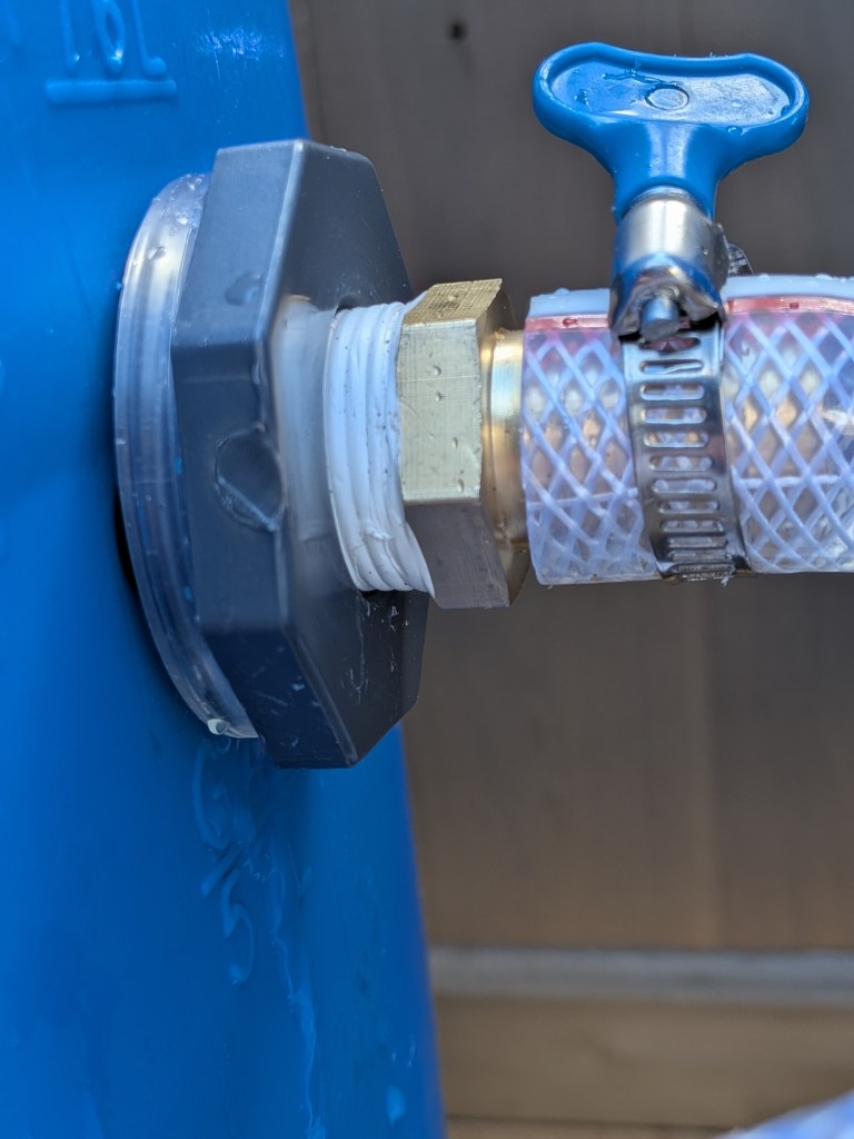 I hooked the whole array back up and now I have a rainwater system for the ages. Or, I will tomorrow once I get the taps in, but that should be a problem free process of Teflon-taping the tap threads and screwing the tap into the bulkhead. I’ll leak test those fittings with the hose, and THEN I’ll replace the screens on the barrel tops, just in case I have to get in there again.